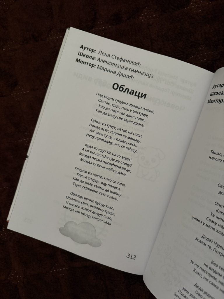 Њена песма „Облаци“ уврштена је у престижни зборник у коме је место нашло 300 најталентованијих младих песника из целе Србије, узраста до 19 година.