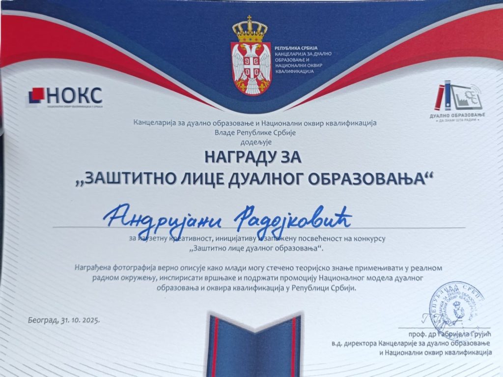 Награђена фотографија верно описује како млади могу стечено теоријско знање применити у реалном радном окружењу, инспирисати вршњаке и подржати промоцију Националног модела дуалног образовања и оквира квалификација у републици Србији.