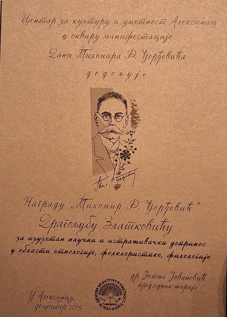 Истраживач народне културе из Пирота, Драгољуб Златковић, добитник је овогодишње награде “Тихомир Р. Ђорђевић”, престижног признања које се додељује за изузетне резултате у фолклористици, етнологији и лингвистици. Награда му је уручена на свечаности у Алексинцу, у оквиру манифестације “Дани Тихомира Р. Ђорђевића”.