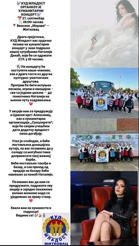 Културно-уметничко друштво „Младост” из Житковца у сарадњи са овдашњим Црвеним крстом ове суботе, 27. септмбра, организује хуманитарни коцерт како би прикупли новчана средста за лечење Наталије Дикић.