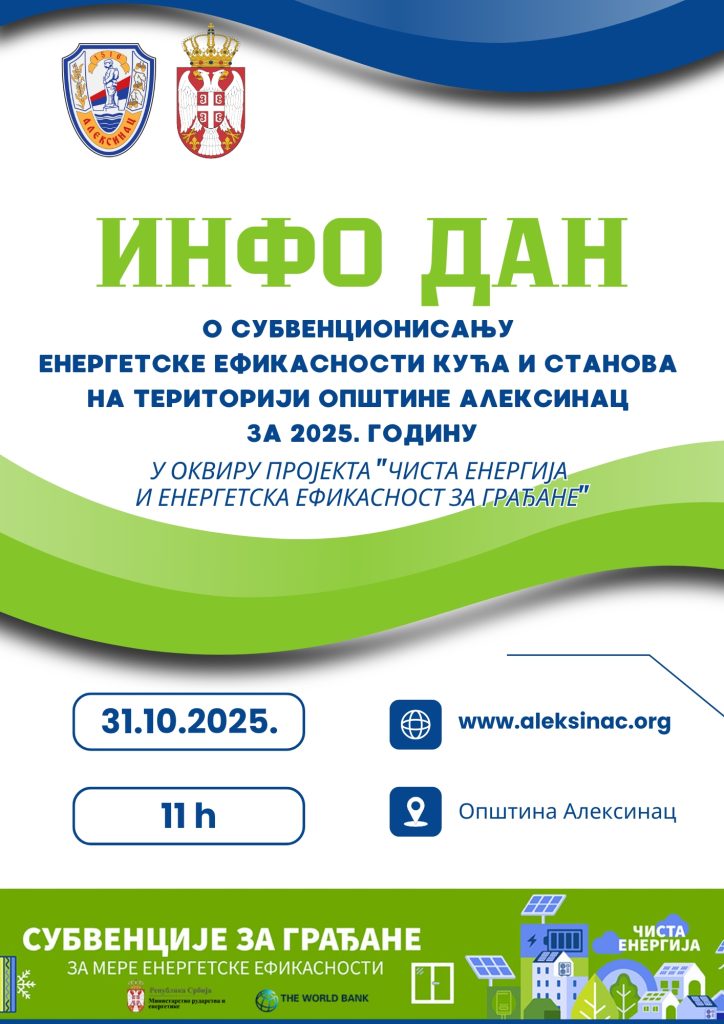 Општина Алексинац позива све заинтересоване грађане да присуствују Инфо дану о Јавном позиву за суфинансирање мера енергетске санације породичних кућа и станова за 2025. годину, који се реализује у оквиру програма „Чиста енергија и енергетска ефикасност за грађане“ Министарства рударства и енергетике Републике Србије.